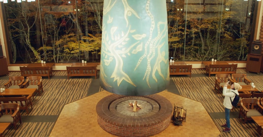 도와다하치만타이 국립공원 내의 오이라세계류의 곁에 유일하게 서 있는 호텔 “호시노 리조트 오이라세계류 호텔”. 호텔 라운지 중앙에는 20세기 후반에 활동했던 세계적으로 유명한 일본인 예술가인 오카모토 다로가 제작한 난로가 있습니다. 굴뚝 부분에는 오이라세계류의 자연을 모티브로 한, 우아하게 흐르는 계류와 새와 인간, 그리고 숲의 요정이 춤추는 모습이 그려져 있어 신비적인 분위기를 자아냅니다.
