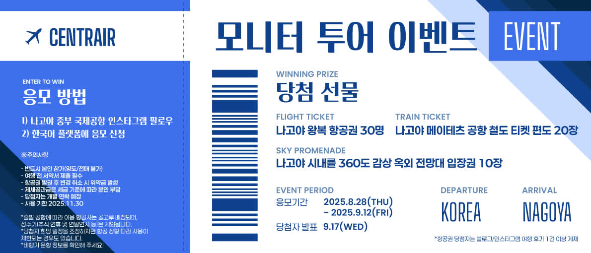 모니터 투어 응모를 통해 나고야 왕복 항공권 30명(인천/김포/김해/청주 출발 항공권), 나고야 메이테츠 공항 철도 티켓 편도 20명, 나고야의 야경을 한 눈에 볼 수 있는 야경 스팟인 나고야 스카이 프롬나드 입장권 10명을 선정하여 제공한다