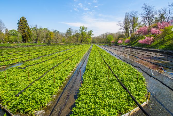 와사비는 일본 몇몇 지역의 강바닥에서 자생하지만, 워낙 까다로운 식물이라 극히 청정한 환경에서만 잘 자랍니다. 다이오 와사비 농장에서는 이웃한 알프스에서 유입되는 미네랄이 풍부한 물과 농장 일꾼의 정성 덕분에 와사비가 잘 자랍니다.