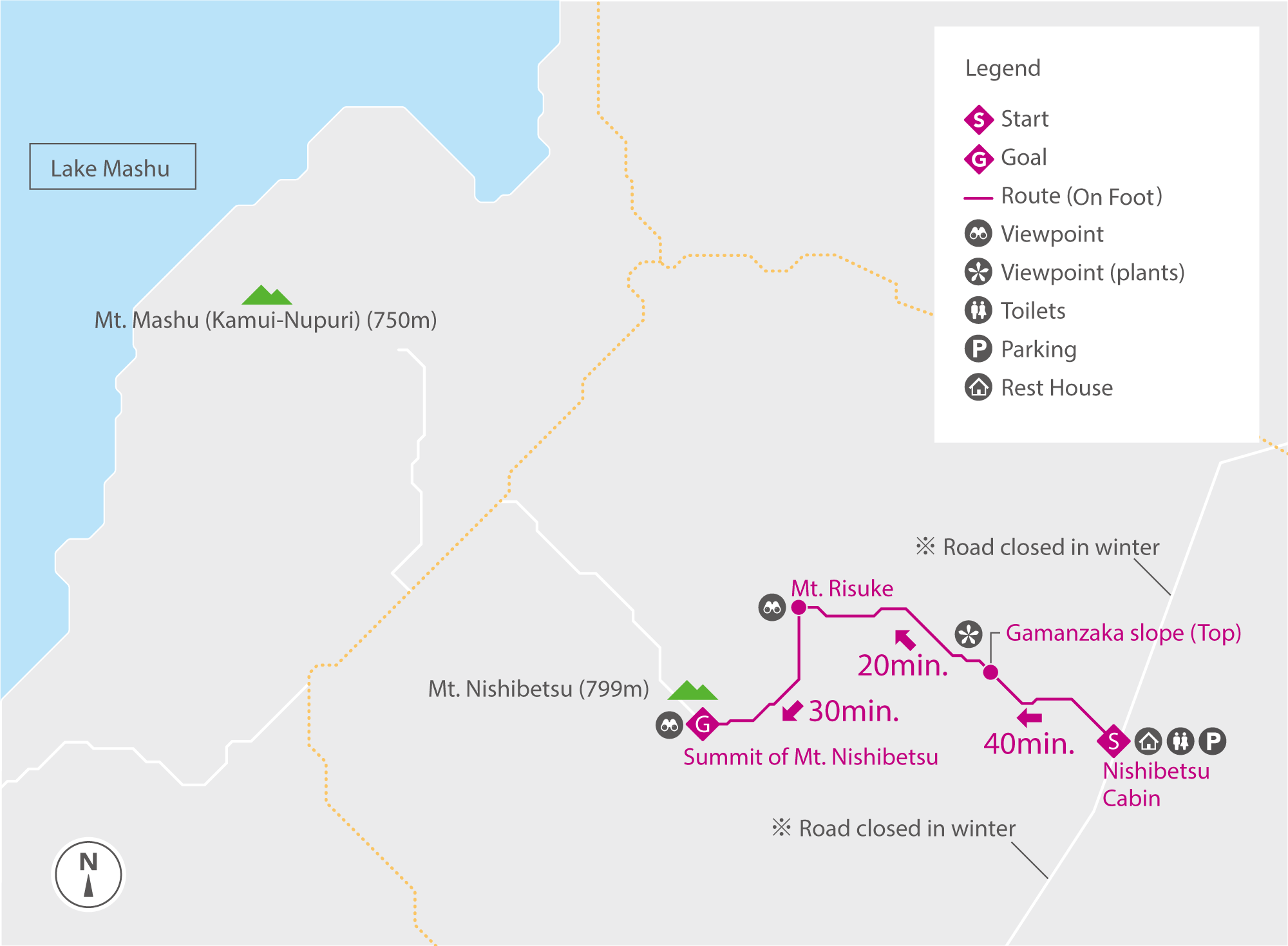 This course starts at the Nishibetsu Mountain Hut and takes you to the summit of the 799-meter Mount Nishibetsu. The trail is deceptively gentle until you arrive at a steep section called Gamanzaka, literally "perseverance slope." Once you conquer Gamanzaka, the path opens up into an expansive meadow. At the summit, enjoy views of Mount Mashu, Lake Mashu and Mount Oakan and Meakan in the distance. On clear days, you may be able to spot the Shiretoko mountain range and Kunashiri Island. The roads to Nishibetsu Mountain Hut are closed in winter: parking is available in front of the forest roads' gates. It's a 2-hour walk from each gate to Nishibetsu Mountain Hut.