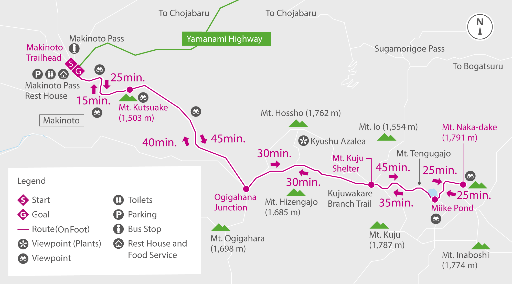 As you reach the Kujuwakare branch trail, you'll see Mount Kuju ahead. Walk around Miike Pond and along the ridge of Mount Tengugajo to reach Mount Nakadake's rocky peak. Retrace your steps to return to Makinoto Pass.