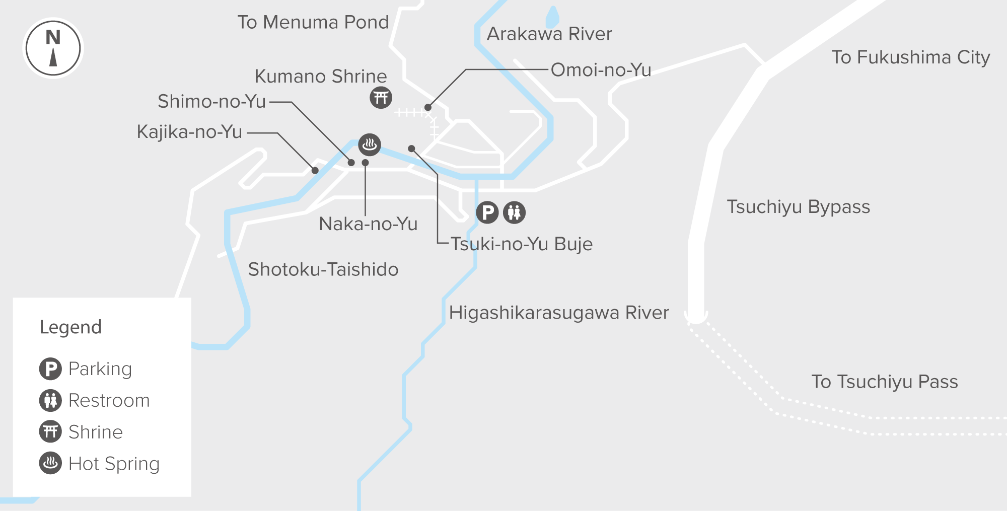 There are numerous free footbaths throughout the town of Takayu Onsen. Enjoy different types of scenery and a variety of water types.