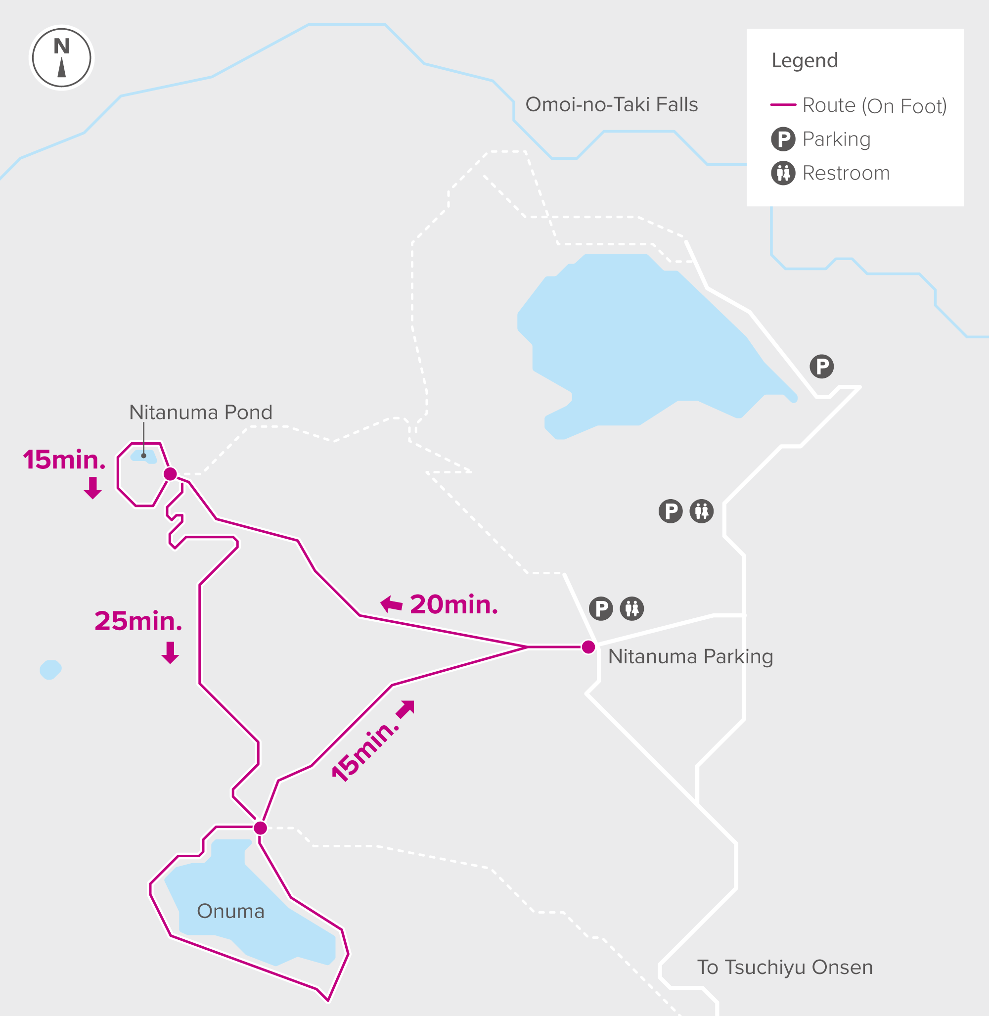 This walk begins at Nitanuma parking lot. The easy trail passes by Nitanuma Marsh and Onuma Marsh. Enjoy seasonal flowers, such as Asian skunk cabbage and dogwood violets in spring. The trail circles back to Nitanuma parking lot without you having to retrace your steps. Relax in a nearby onsen after a leisurely tour of the marshland.