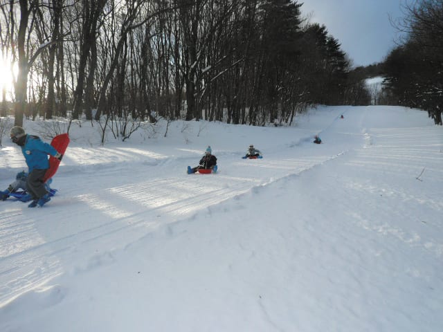 Bandai × 2 Family Snow Park is a ski and sledding resort in the eastern foothills of Mount Bandai, located 680 meters above sea level. It features an exciting 600-meter sledding course called the Sori Okoku (Sledding Kingdom), a kid's ski area and two ski lifts. The whole family will enjoy the powdery snow with Mount Adatara as the backdrop. Ski and snowboard classes for all ages are available at the ski school, and equipment can be rented from the ski lodge.