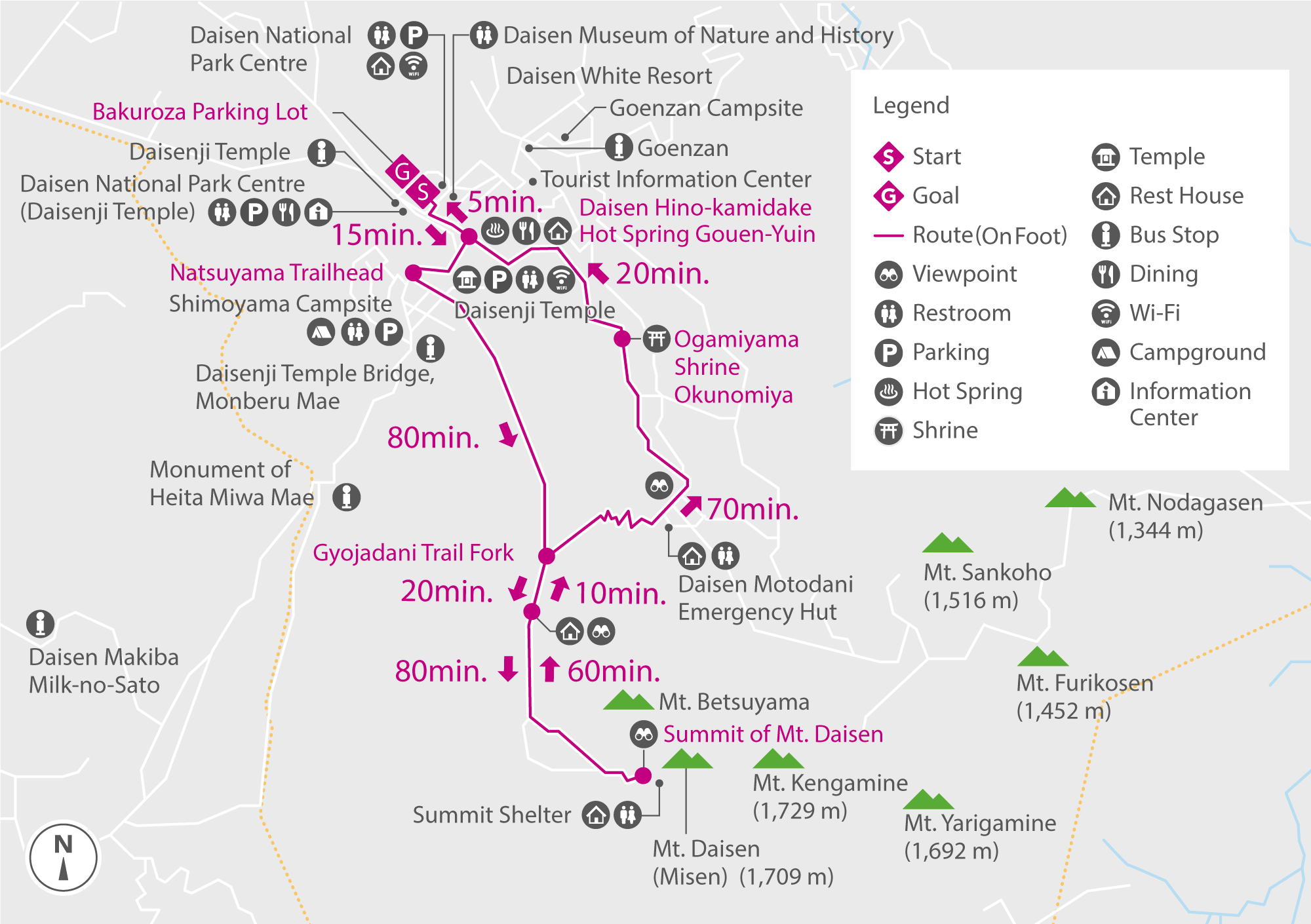 On a clear day, you will enjoy splendid views of the Sea of Japan and the Shimane Peninsula from Misen Peak. As you descend, you will reach the Gyojadani trail fork. From there, take the route toward Ogamiyama-jinja Okumiya Shrine. After you pass Daisenji Temple at the bottom of the trail, continue on for another 5 minutes to reach the Daisen Hinokami Goen Yuin hot spring facility, a great spot for a relaxing soak after you finish your hike.