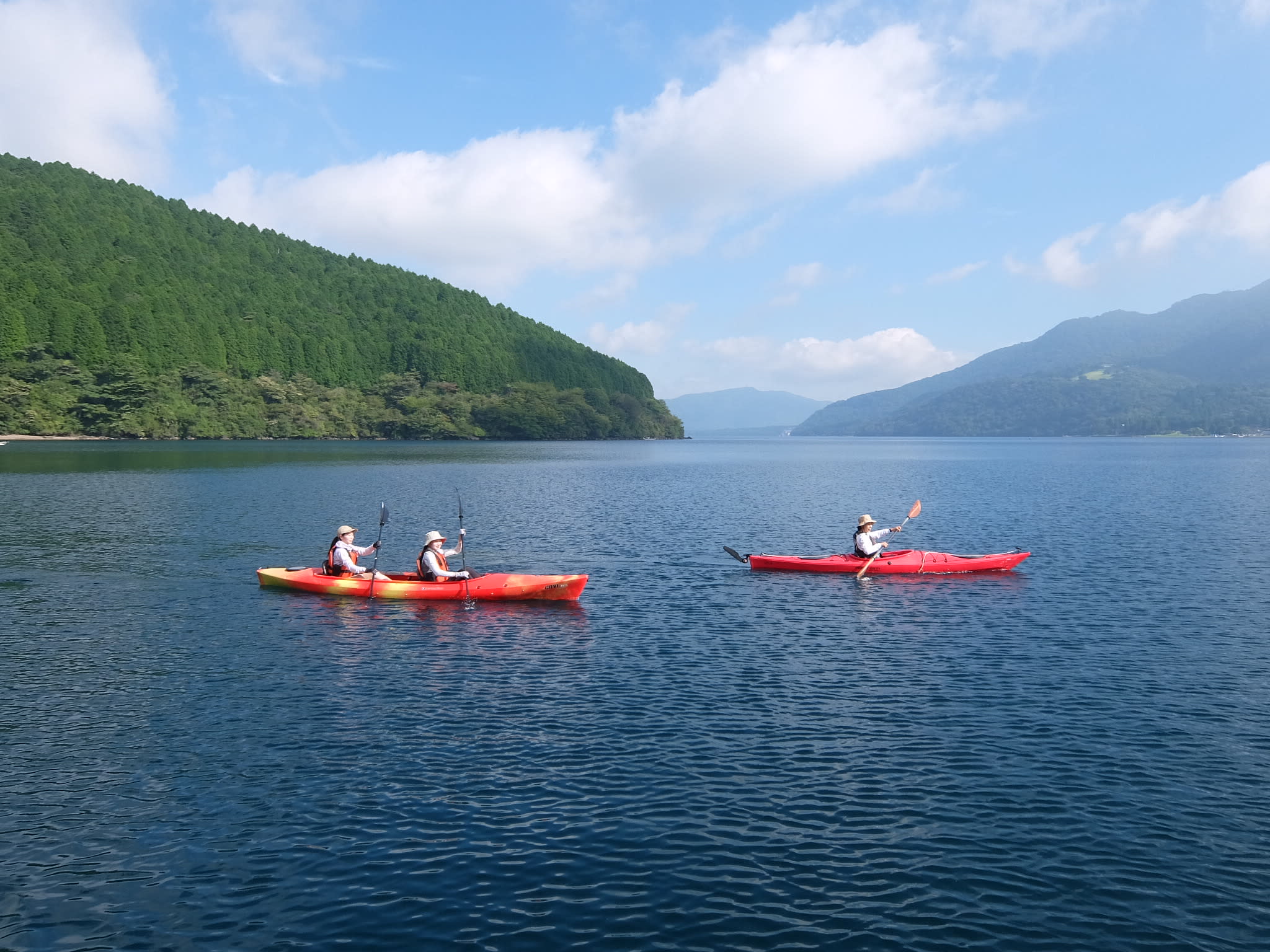 Anyone can participate in guided kayak experiences on Lake Ashinoko. Three courses are available: one that heads for the "floating" torii of Hakone-jinja Shrine; another that goes along the western shore of the lake; and one that brings you to the torii of Kuzuryu-jinja Shrine.