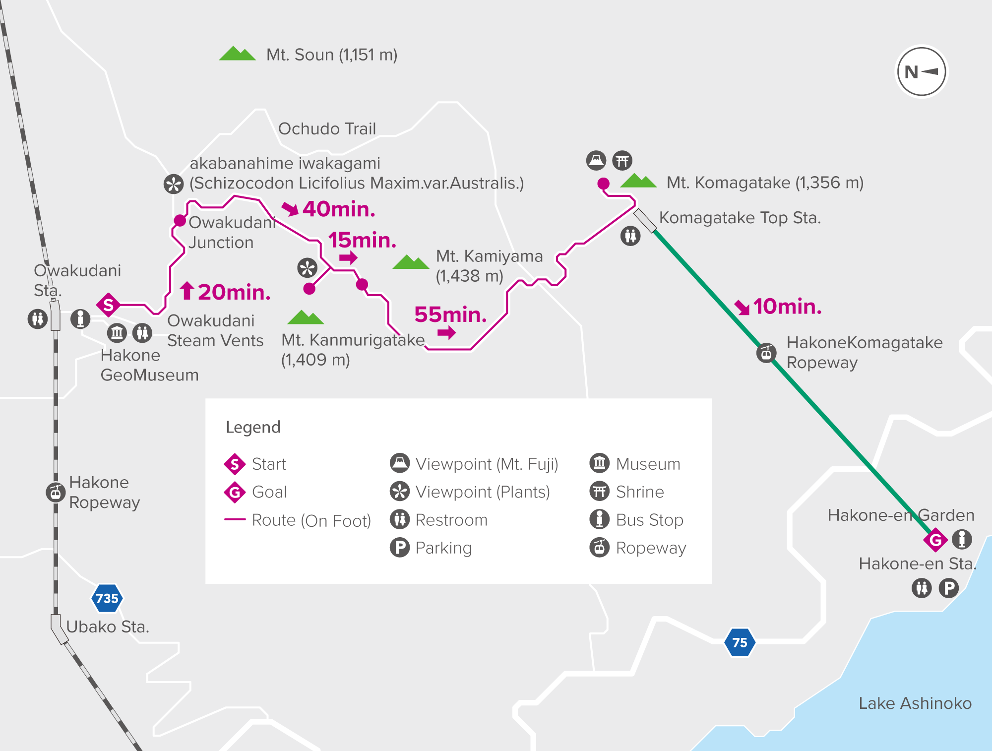 The trail starts at Owakudani Station on the Hakone Ropeway. Trek to the peak of the 1,438-meter Mount Kamiyama, the highest point in Hakone, then head further on to Mount Komagatake for beautiful views of Lake Ashinoko, Suruga Bay and Mount Fuji. You can spot traces of volcanic activity and a variety of plants throughout the hike. Descend via the Hakone Komagatake Ropeway, which takes you to Hakone-en Station. Note that parts of the hike can be rocky or slippery; proper hiking gear is a must.