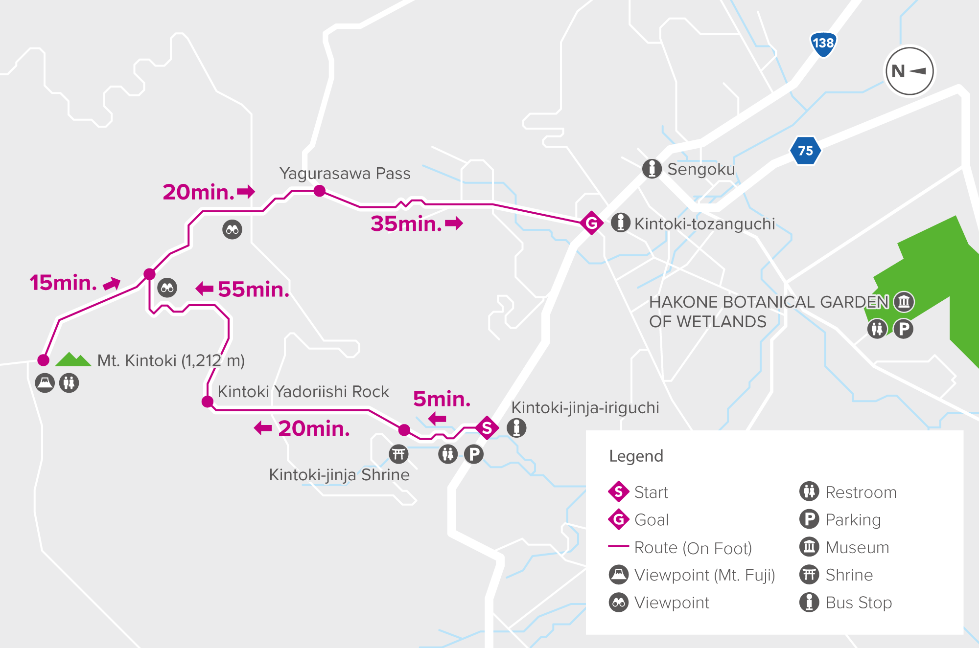 Mount Kintoki is famous for the legend of Sakata Kintoki (Kintaro)—a warrior of superhuman strength who was raised by a witch on the slopes of the mountain. The trail starts at the Kintoki-jinja-iriguchi bus stop. There are also car parks at this location. After a few minutes' walk the trail leads to Kintoki-jinja Shrine, where you can see a giant axe similar to the one Kintaro is said to have used in the Kintaro folk story. From here, the trail gets steeper and leads up to the summit of Mount Kintoki, 1,212 meters above sea level. There are two tea houses at the summit where you can get refreshments and take a few moments to enjoy the panoramic views of Mount Fuji and Owakudani Valley. The trail then leads down through the Yagurasawa Pass, finishing at the Kintoki-tozanguchi bus stop.