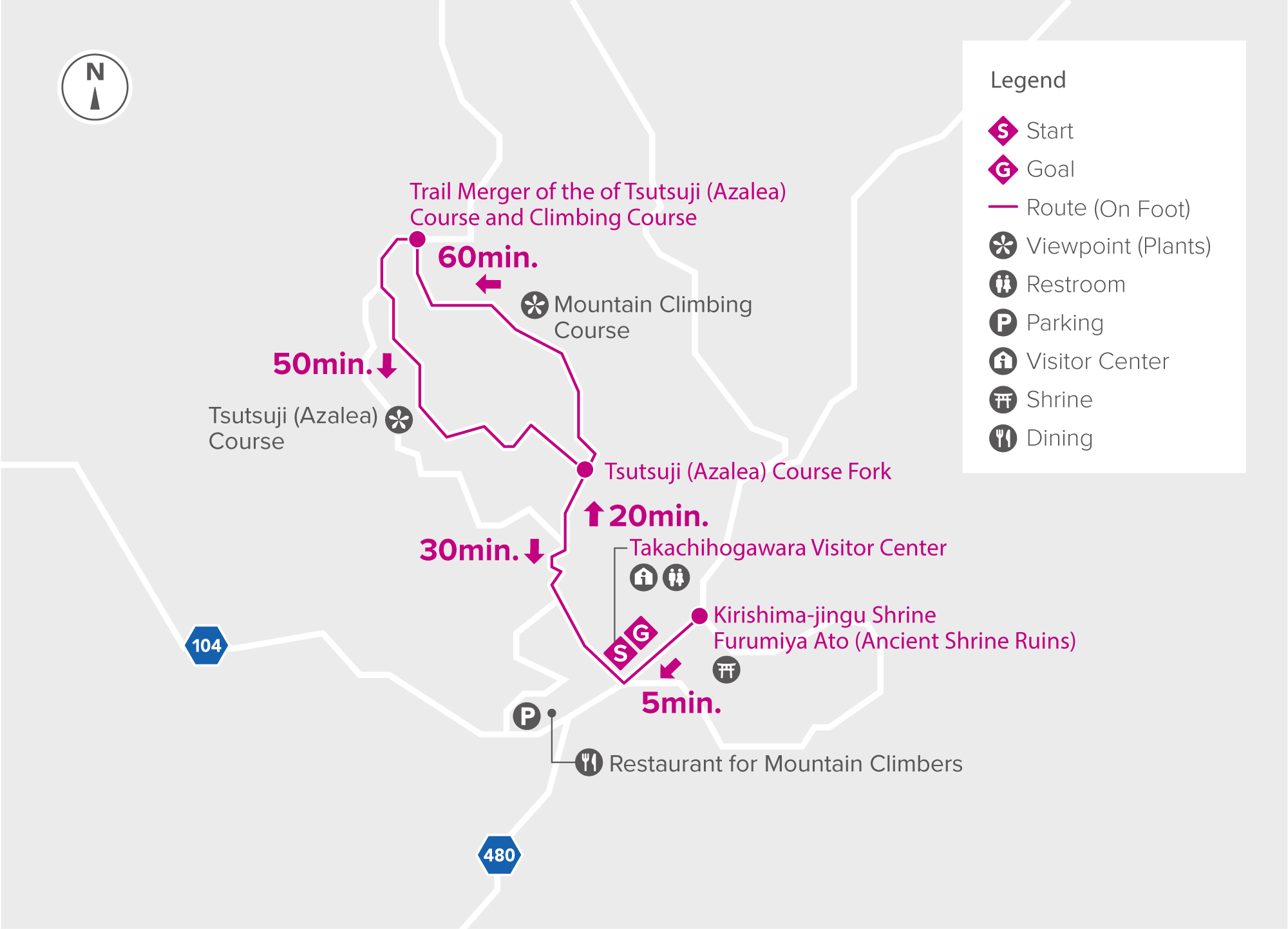 This course takes in the history and culture of the Mount Nakadake area as well as its diverse flora and fauna. The hike starts at Takachihogawara, the southernmost access point to the Kirishima mountain range. The path continues along the Mount Nakadake Chuufuku scenic route and on to the ruins of ancient Kirishima-jingu Shrine. This area is popular with hikers because it is close to the starting point for both the Mount Nakadake Chuufuku scenic route and the Mount Takachiho-no-Mine route.
