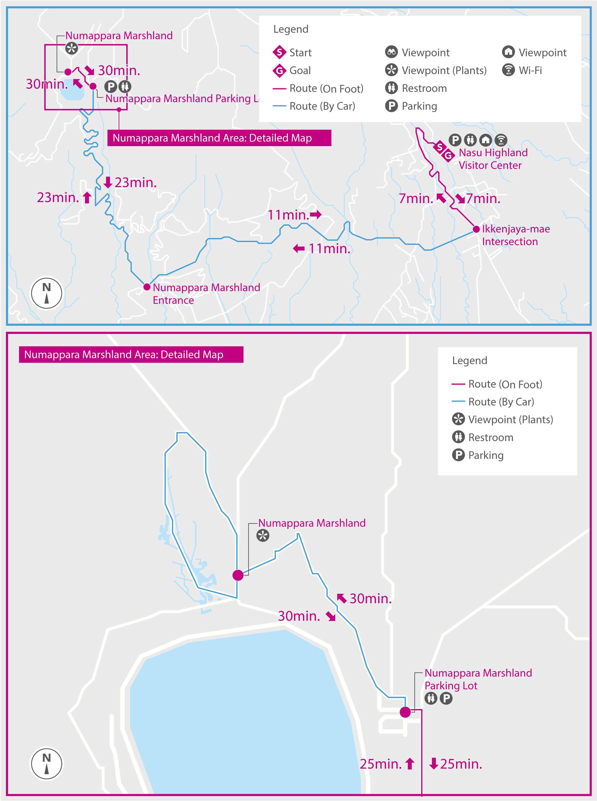 Numappara Marshland is located 1,230 meters up on the western edge of the Nasu mountain range. The boardwalk trail that circles the area allows you to enjoy marshland nature and seasonal vegetation, such as broad dwarf daylilies in early summer and colorful marsh grasses in the fall. The drive to Numappara Marshland takes you west on a pleasant woodland road running parallel to the Nasu mountain range beneath a canopy of Erman's birch trees.