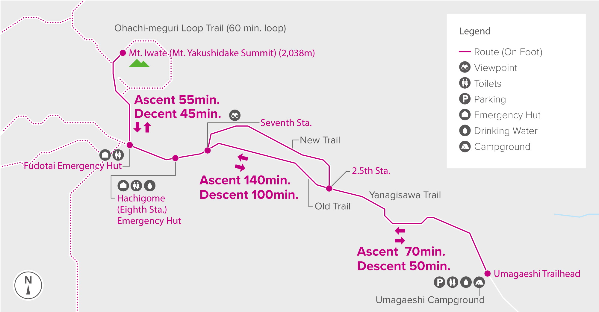 The course begins at the 633-meter Umagaeshi Trailhead in Takizawa City and offers excellent views of Morioka City and the Kitakami Mountains throughout the hike. After the Second Station (a waypoint marking the second stage of the hike), you have the option to select between a forest path or a rocky path with unobstructed views. At the Eighth Station, take a break at Fudotai Hut before the last stretch of the climb to Mount Iwate's summit. You can replenish your water supplies at the Onari-Shimizu Spring near the hut.