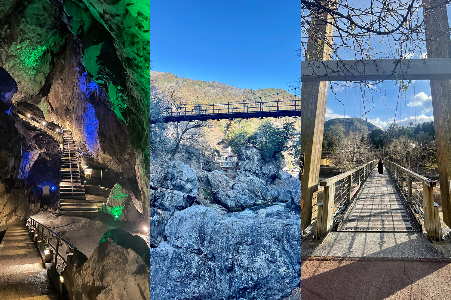 鸽巢溪谷(鳩ノ巣渓谷):也是一个风景绝美的地方!吊桥的旁边也有一个小瀑布!其实这里特别适合和朋友们夏天来!因为来到这里你就会被溪谷清澈见底的水给吸引!忍不住想进在水里玩耍~