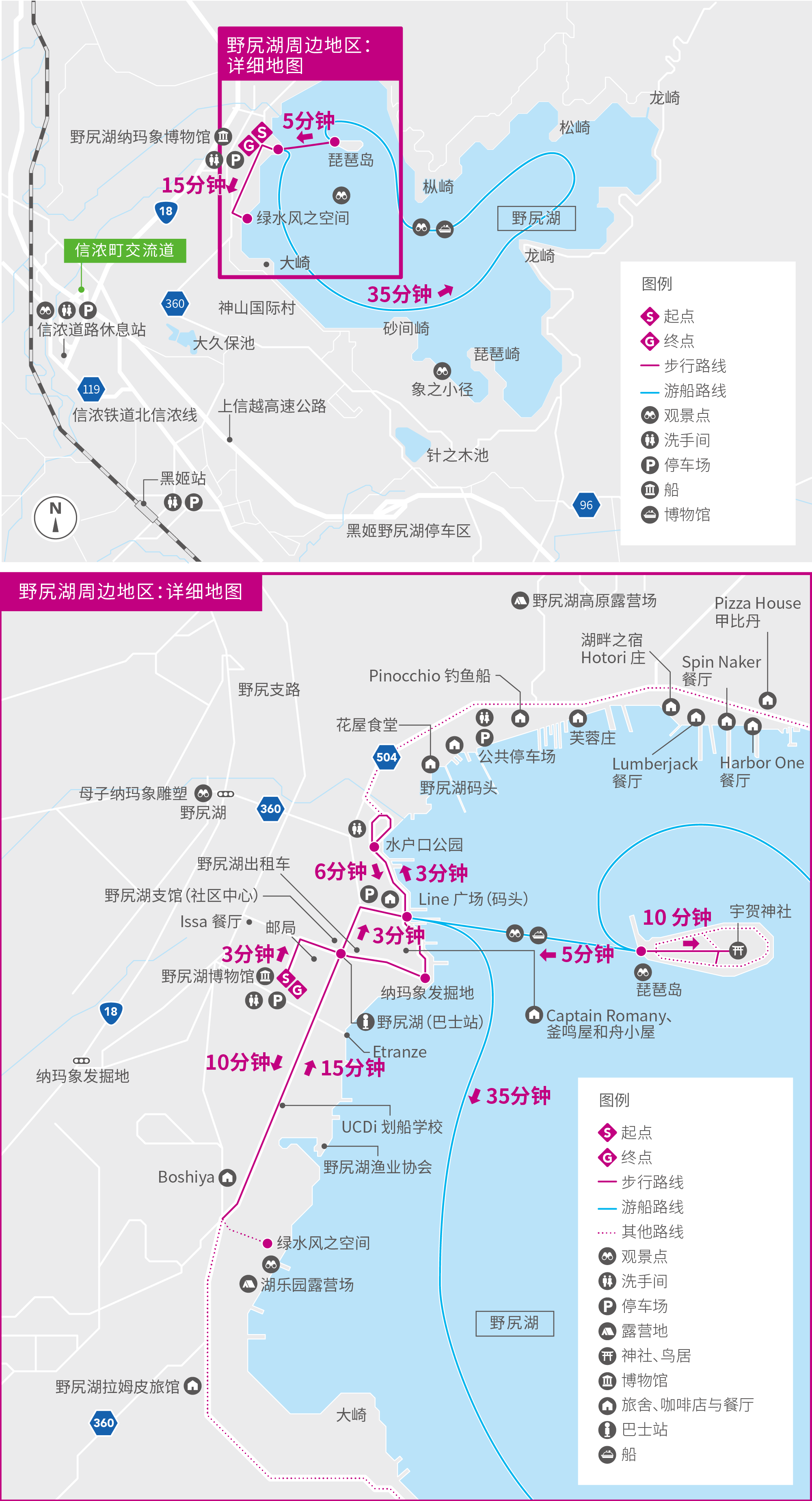 野尻湖的湖底是史前化石和石器的考古遗址。该地区出土了诺氏古菱齿象和矢部氏巨角鹿的化石,这些化石就陈列于这条路线的起点——野尻湖博物馆。参观完博物馆后,您可以沿着湖畔漫步,然后乘船游览神圣的岛屿,并品尝当地种植的蔬菜。