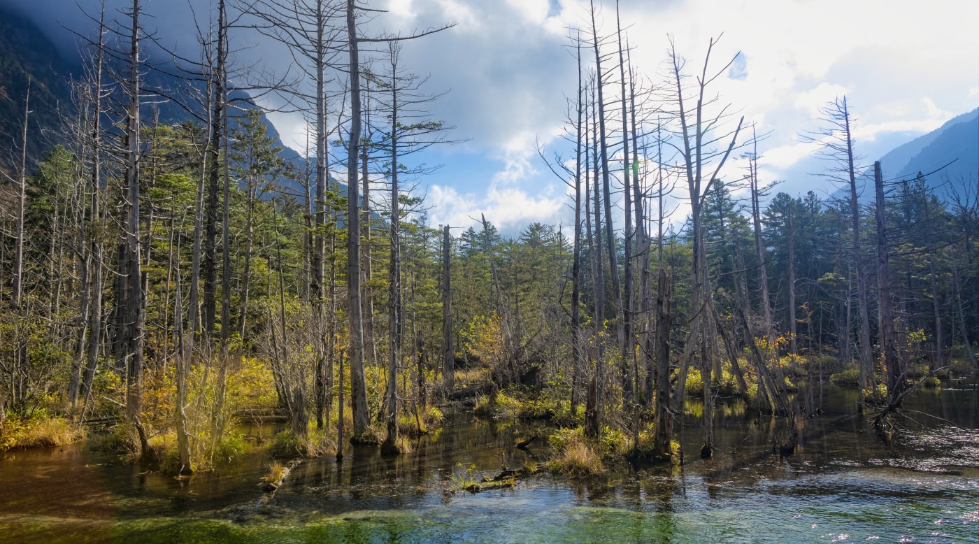 上高地有許多美麗的地方,而大嶋最喜歡的景點就是岳澤濕地。大嶋表示:「儘管中部山岳國家公園處處都是令人驚艷的美景,但我強烈建議初遊旅客造訪此處。」這片濕地的水源來自岳澤峽谷的冰雪融水,若從合羽橋出發,沿著梓川步行約 15 分鐘即可抵達明神池。明神池環境幽靜,於此可將六百山的美景一覽無遺。潺潺溪水清澈見底,站在木棧道上低頭即可看見魚兒歡快地游水。岳澤濕地出入方便且環境優美,遊客常沉浸於此,流連忘返。