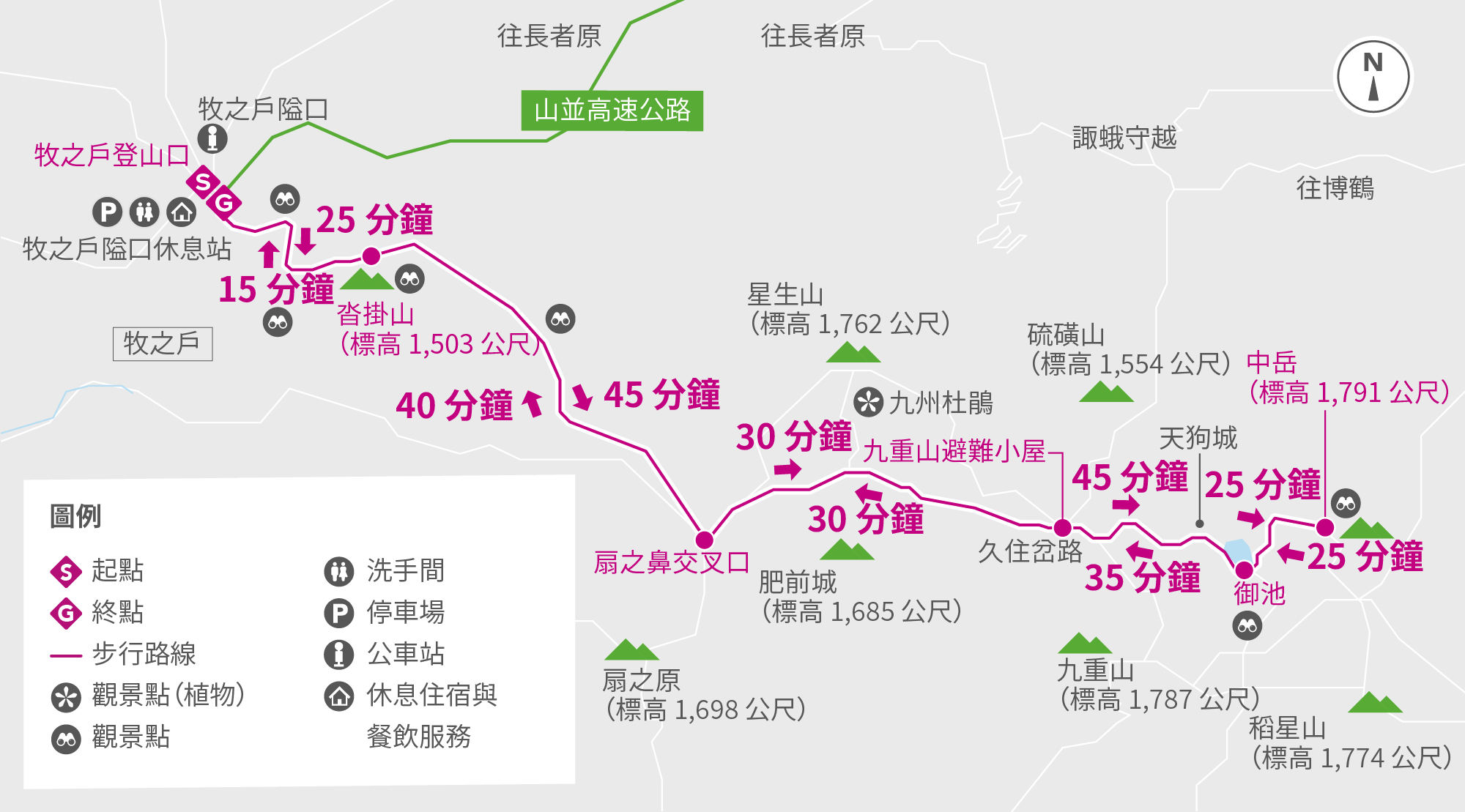 到了久住岔路後,可看到前方的九重山,再沿著御池和天狗城山脊前進,即可抵達中岳遍布岩石的山峰,最後原路返回牧之戶隘口。