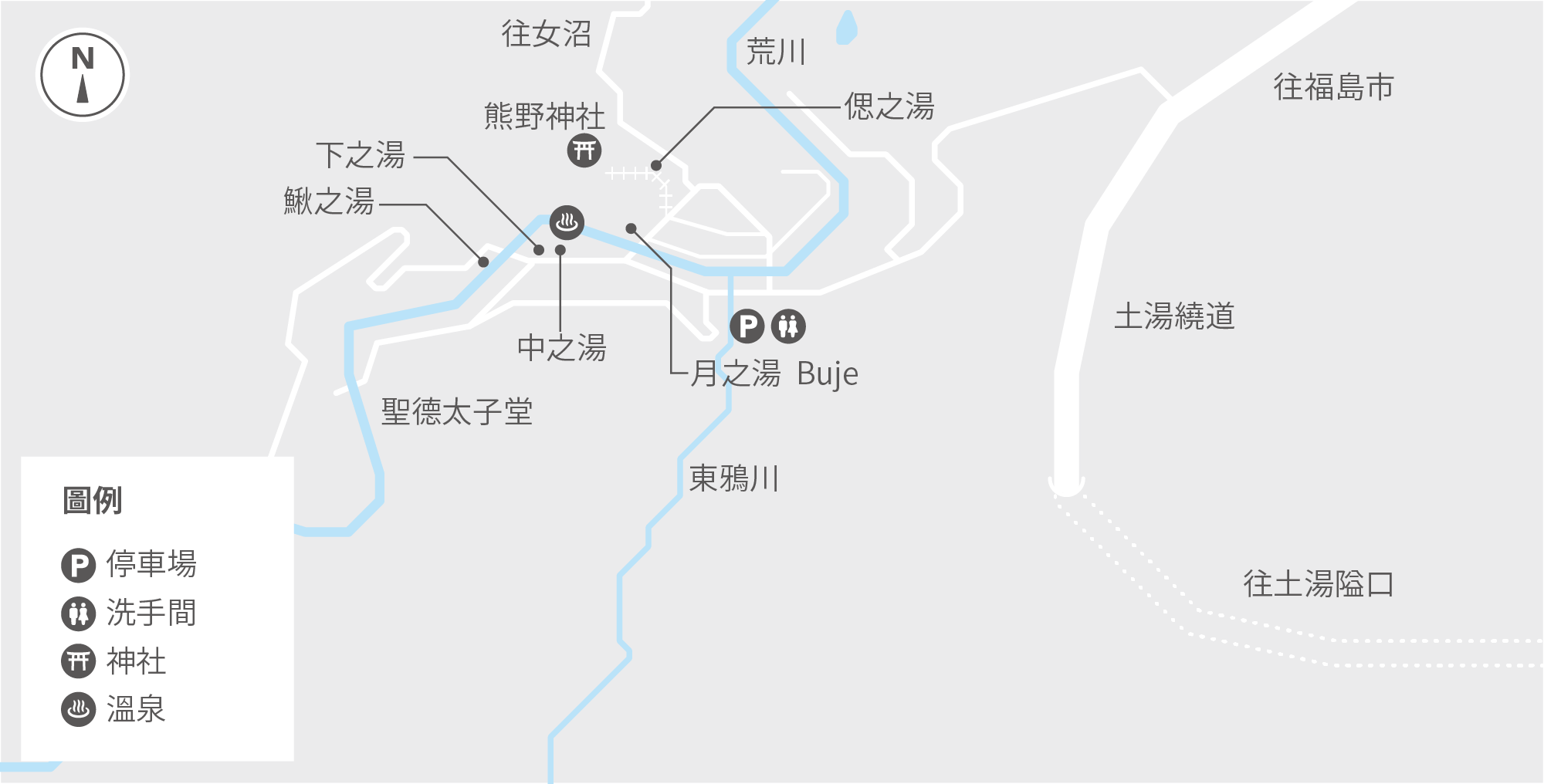 下之湯 (Shimo-no-Yu) 位於小鎮中心,設有三個不同水溫的足湯浴池。附近的商店有販售飲料、蒸包子和各式點心,可一邊享受足浴一邊品茶。日落之後,木芥子娃娃燈籠會點亮街道,增添令人陶醉的氛圍。營業時間:8:00~20:00 費用:免費