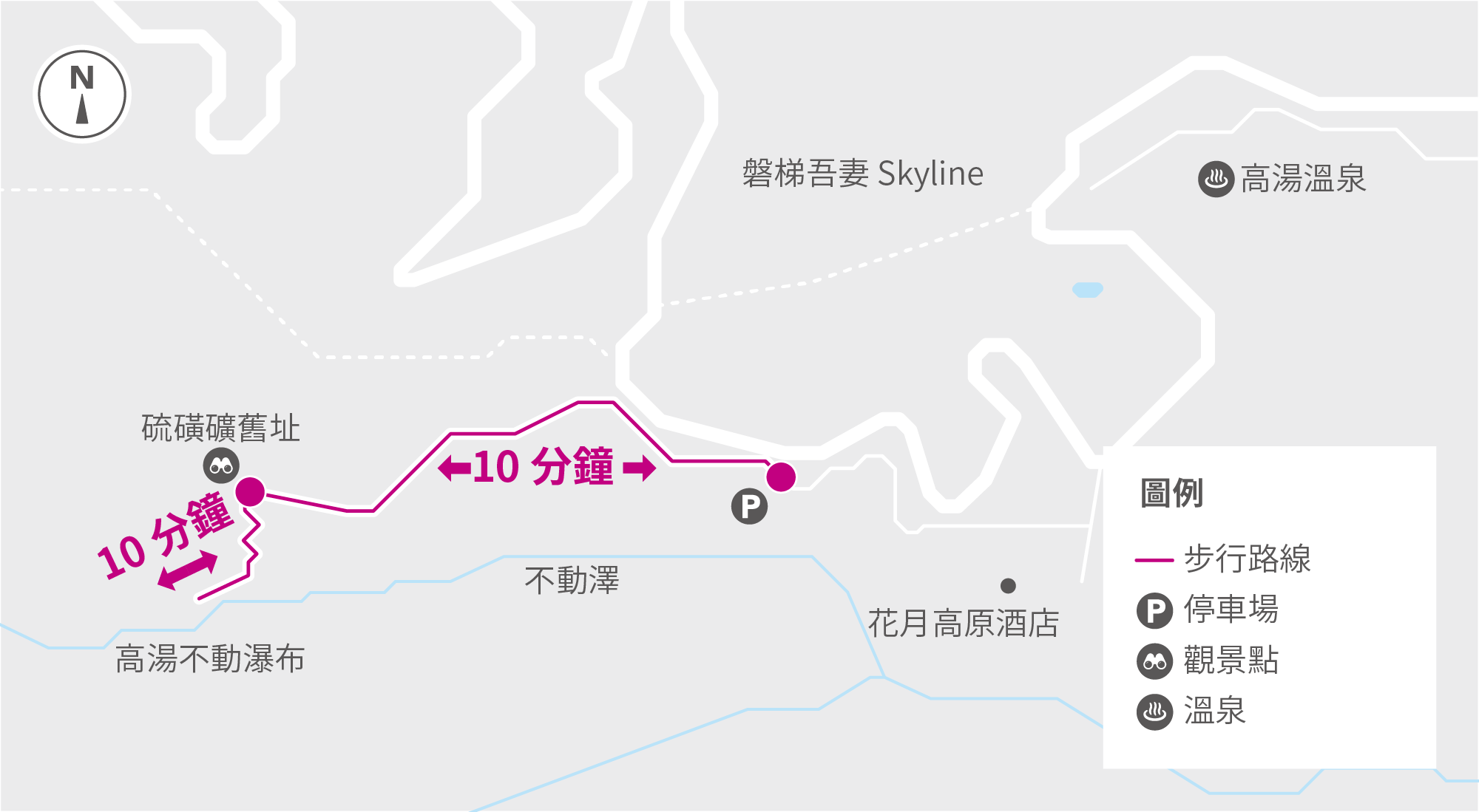 不動瀑布就在高湯溫泉小鎮不遠處,通往瀑布的路則位於小鎮的花月高原酒店 (Kagetsu Highland Hotel) 附近,途中會經過在日文稱作「Botayama」(廢土堆)的硫磺礦舊址,徒步約 20 分鐘即可抵達不動瀑布。飽覽瀑布美景後,可返回高湯溫泉,浸泡在乳白色的溫泉水中放鬆身心。