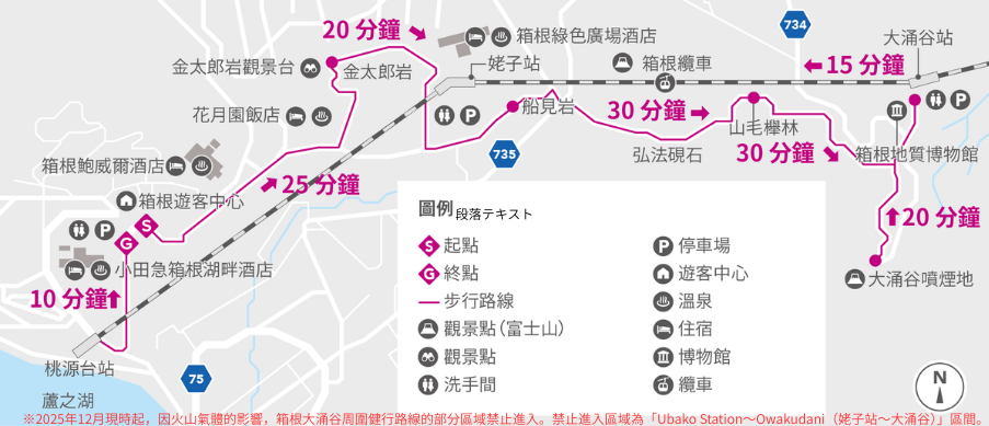 箱根遊客中心為此健行路線的起點,其寬闊道路亦適合帶著小孩同遊的家庭。登山過程中可觀察到沿途樹種隨海拔高度產生的變化,低海拔處生長著日本扁柏,到了高處則變成山毛櫸和日本紫莖。抵達大涌谷後,可欣賞到噴氣口、冒泡的硫磺池和其他壯麗景色,此外也可前往箱根地質博物館參觀,最後搭乘箱根纜車下山,回到桃源台站。
