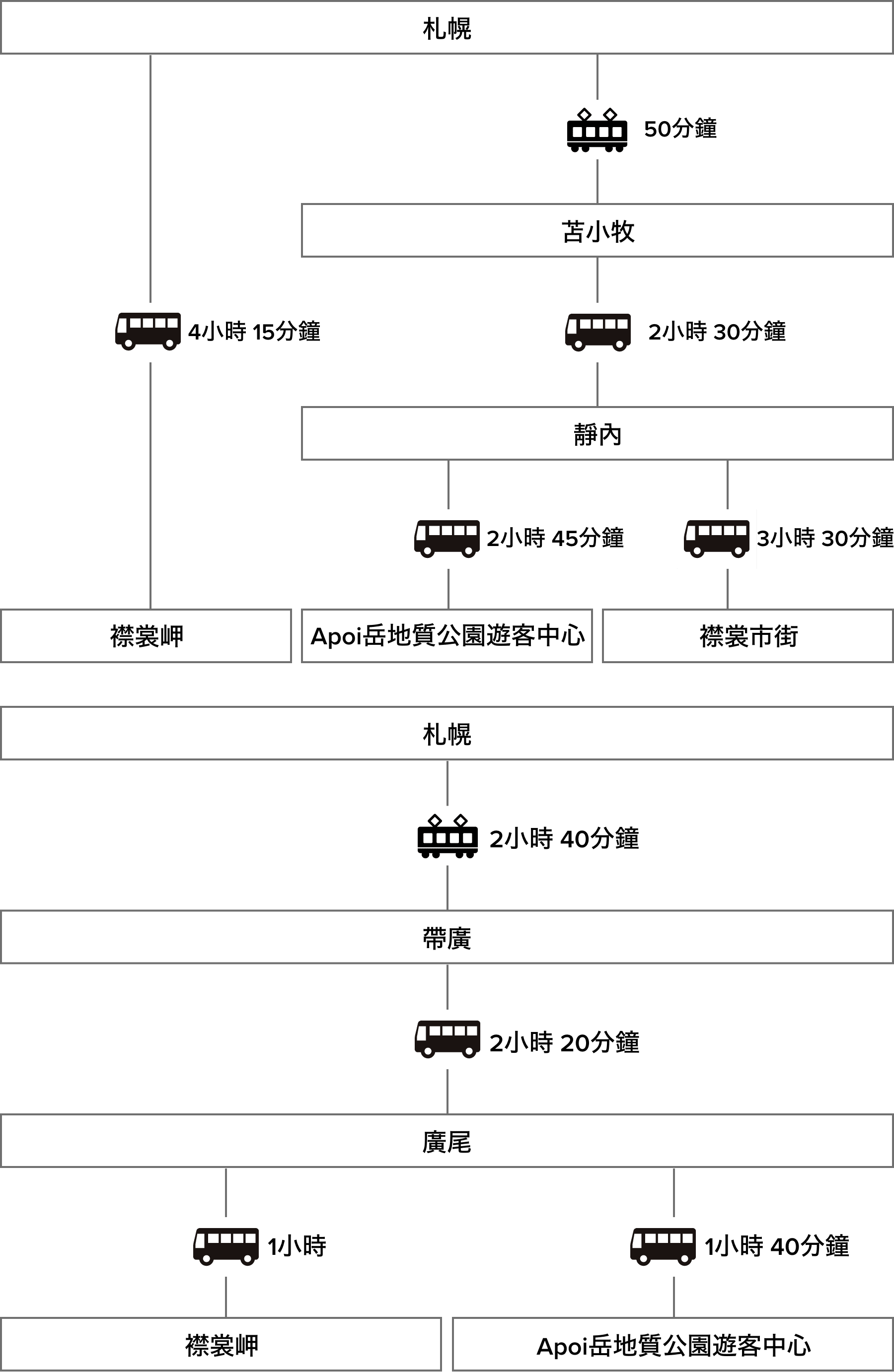 從札幌有通往襟裳岬(約4小時15分鐘)等地的直達高速公車,但一天只有一來回,班次非常少。建議搭乘JR特急前往苫小牧(約50分鐘)或帶廣(約2小時40分鐘),在車站租賃汽車。搭乘大眾交通工具前往時,可從苫小牧站搭乘路線公車前往靜內(約2小時30分鐘),轉乘公車前往Apoi岳地質公園遊客中心(約2小時45分鐘)或襟裳市街(約3小時30分鐘),不過班次有限。此外,由帶廣車站經中札內村(約1小時)往廣尾(約2小時20分鐘)的路線公車,每隔1~3小時有一班。從廣尾往襟裳岬(約1小時)或Apoi岳地質公園遊客中心(約1小時40分鐘)也有公車可以搭乘,但班次非常稀少,能有效轉乘的的車次並不多。