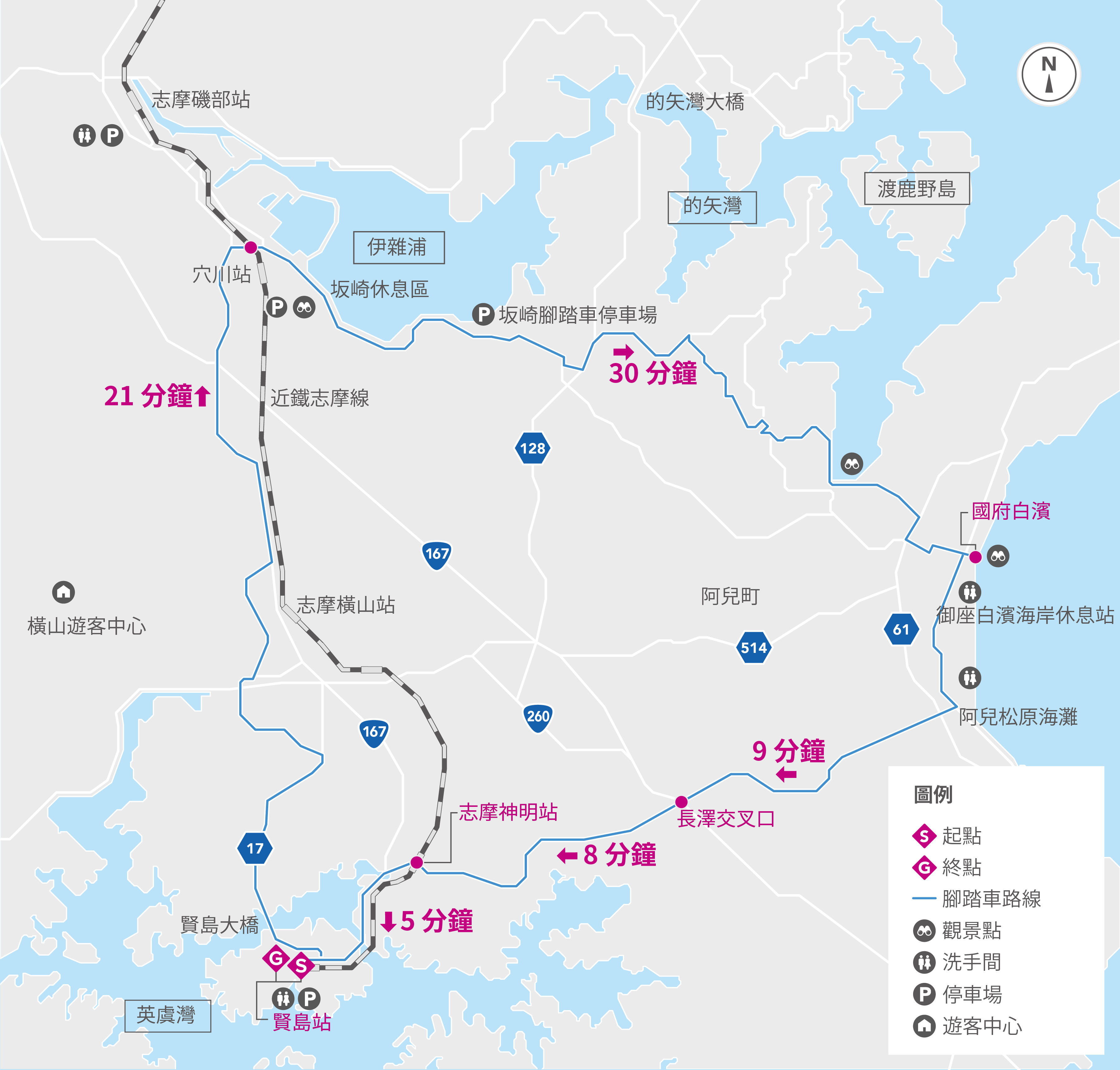 此路線以賢島為起點,沿著縣道 17 號與國道 167 號延伸,穿過本州向北通往伊雜之浦。路上車流量通常較大,若想避免塞車,建議從志摩磯部站或穴川站出發。