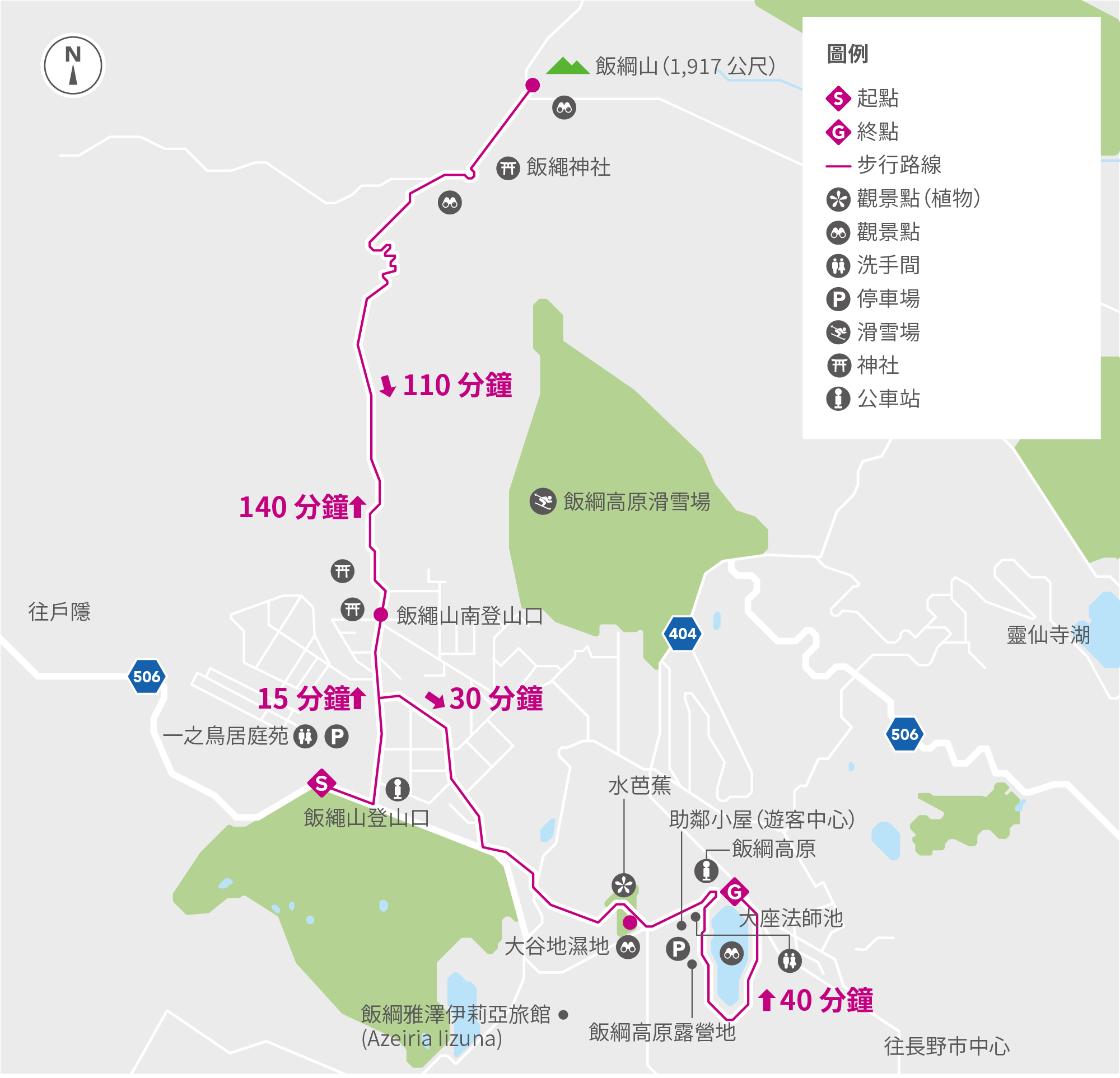 飯繩山古時為「山嶽信仰」的重要場所,時至今日仍保留著這段歷史的遺跡,其登山口處豎著鳥居和守護神像,途中更林立著許多石佛像。山頂為海拔 1,917 公尺,可於此飽覽長野市的壯麗景色。下山後,可前往繁花錦簇的大谷地濕地或寧靜的大座法師池稍作休息,亦可至附近的溫泉享受泡湯樂趣。(注意:山頂附近設有便攜式流動廁所,但需自行攜帶垃圾袋。)