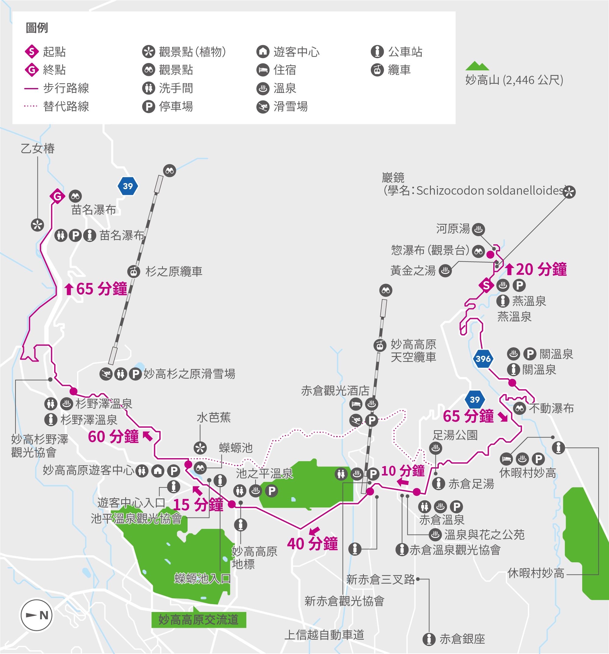 蠑螈池位於路線中央,可在這裡稍作休息,還能隔著水面遙望妙高山美景。此處亦設有遊客中心和小吃店,可於遊客中心將周圍群山的壯麗風光盡收眼底,夏季時更可至不遠處搭乘杉之原纜車。路線終點則為名列「日本瀑布百選」的苗名瀑布。