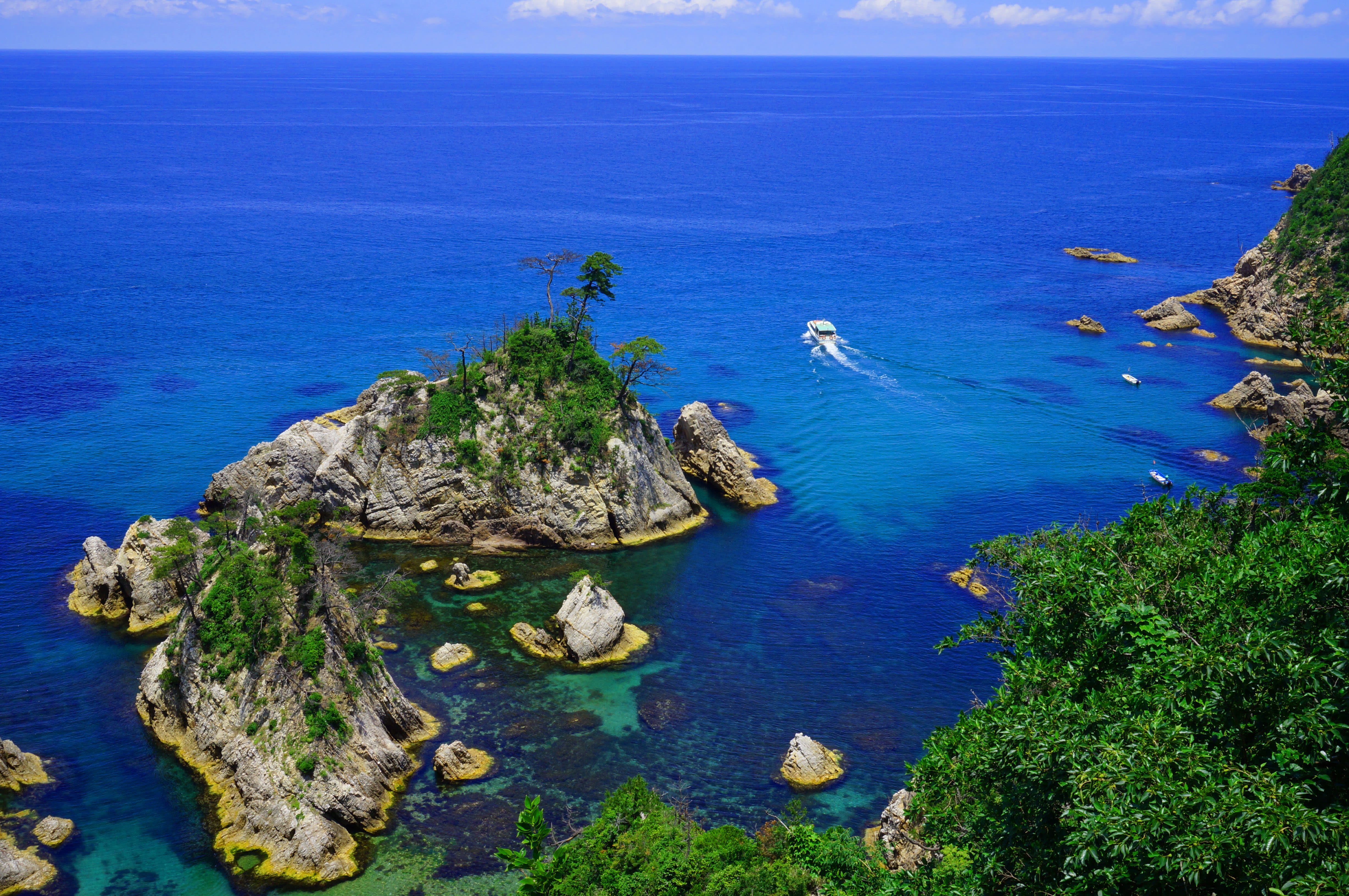 在山陰海岸國家公園中搭乘遊覽船,巡航風光明媚的浦富海岸。