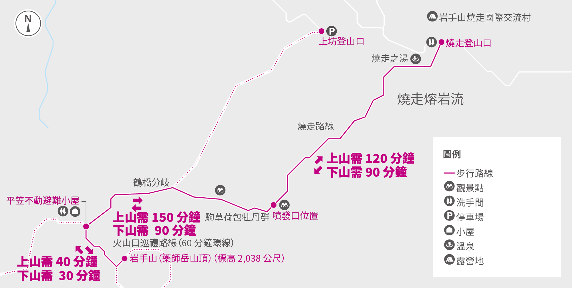 燒走登山路線以位在岩手山東北坡的燒走熔岩流為起點,登頂時會途經 2 座火山噴發口,可從這裡環視由硬質熔岩構成的廣闊地景。6 月下旬時,當地的原生花卉齊放,帶來花團擁簇的優美景色。這條步道的許多路段(例如八合目)甚為適合欣賞岩手山的美景。