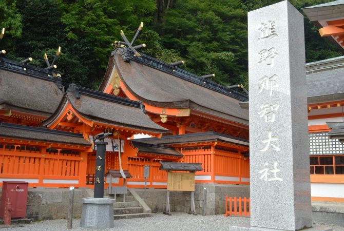 Um dos chamados santuários Kumano Sanzan é um dos destinos finais dos peregrinos que percorrem a histórica Rota de Peregrinação de Kumano Kodo .