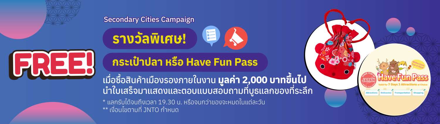 1. ซื้อสินค้าไปเที่ยวเมืองรองจากสายการบิน หรือบริษัททัวร์ผู้ออกบูธภายในงานเที่ยวญี่ปุ่นด้วยตัวเอง&ทัวร์ ครั้งที่ 17 มูลค่า 2,000 บาทขึ้นไป (สามารถรวมใบเสร็จได้)