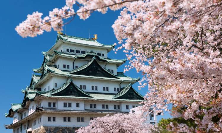 แลนด์มาร์กสำคัญของเมืองนาโกย่า (Nagoya) และเป็นหนึ่งในจุดชมซากุระยอดนิยมของภูมิภาคชูบุ บริเวณรอบปราสาทและริมคูน้ำ มีต้นซากุระกว่า 1,000 ต้น บานสะพรั่งไปด้วยสีชมพู ตัดกับภาพตัวปราสาท และหลังคาประดับรูปปั้นปลาหัวเสือทองคำ (Kinshachi) อันเป็นเอกลักษณ์