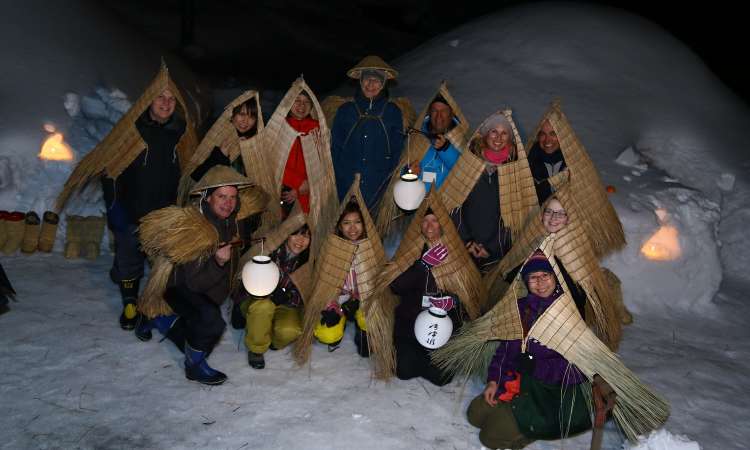 • ทดลองสวมชุดสึเกะโบชิ (Sugeboshi) ชุดกันหิมะที่ทำจากหญ้าสึเกะ (Suge) เดินเล่นและถ่ายรูปเป็นที่ระลึก