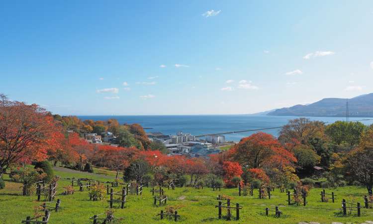 เป็นสวนที่ตั้งอยู่บนเนินเขา จึงมองเห็นทั้งทิวทัศน์ของสวน พร้อมฉากหลังที่เป็นวิวท้องทะเล และท่าเรือโอตารุ ได้อย่างเต็มตา