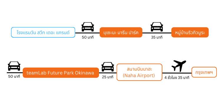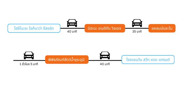 การเดินทาง | จาก Naha Airport โดยรถยนต์ หรือ รถบัสลีมูซีนของสนามบิน ใช้เวลา 60 นาที |