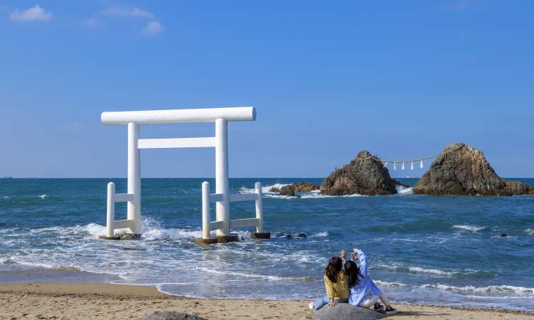 ซากุระอิ ฟุตะมิกะอุระ (Sakurai Futamigaura) หินคู่ที่คล้องด้วยเชือกชิเมะนาวะ (Shimenawa) อันศักดิ์สิทธิ์ เปรียบเสมือนคู่แต่งงาน ซึ่งเชื่อกันว่าหากได้มาขอพรเนื้อคู่ก็จะสมหวัง อีกทั้งยังโดดเด่นด้วยเสาโทริอิสีขาวตั้งอยู่ริมชายหาด ถือเป็นจุดถ่ายรูปที่ห้ามพลาด บริเวณนี้ดูสวยงามได้ในทุกช่วงเวลาของวัน โดยเฉพาะวันที่ฟ้าโปร่ง และพิเศษไปกว่าเดิมหากเป็นช่วงอาทิตย์ตก ท้องฟ้า และท้องทะเลจะถูกสาดไปด้วยสีส้ม โดยเฉพาะช่วงวันครีษมายันตอนที่พระอาทิตย์ตกจะอยู่ตรงกลางระหว่างหินคู่อย่างพอดิบพอดี