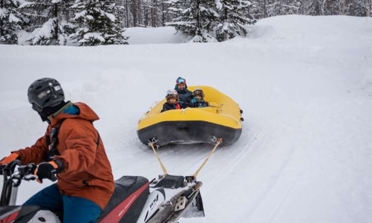 โดยมีรถสโนว์โมบิล (Snow Mobile) คอยลากแพยางไปบนหิมะราวกับว่าเล่นล่องแก่ง