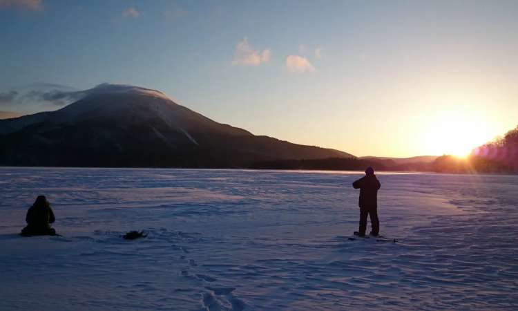 ใต้น้ำแข็งที่ทะเลสาบซะโฮโระ (Sahohro Lake) โดยจะทำการเจาะรูบนพื้นน้ำแข็ง และหย่อนคันเบ็ดลงไป