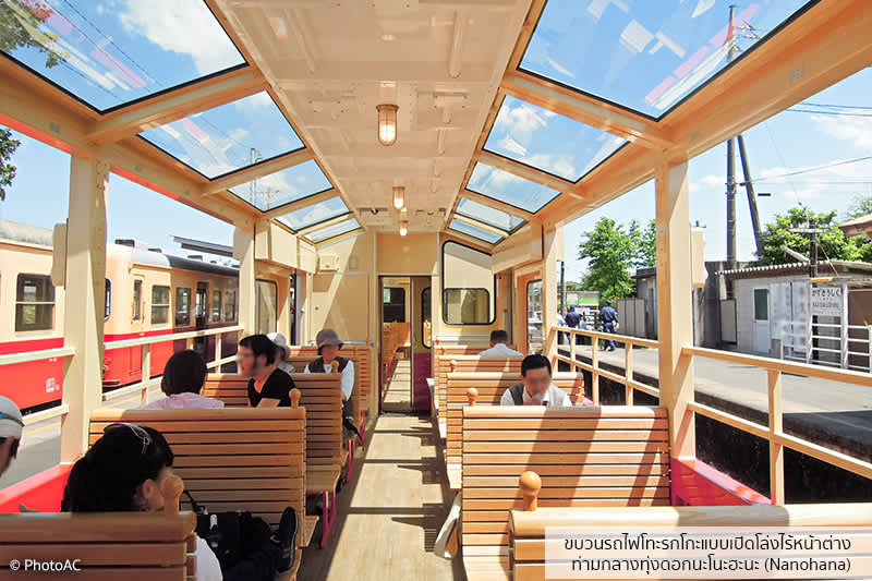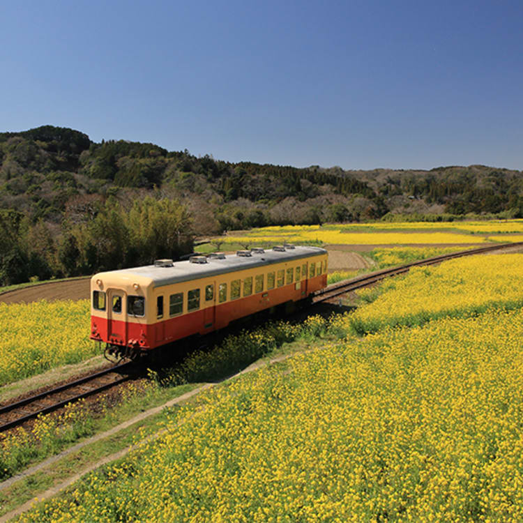 นั่งรถไฟโทะรกโกะ (Torokko Train) ไปท่ามกลางแสงแดดฤดูใบไม้ผลิที่สดใสอบอุ่น ในขอบเขตเส้นทางเดินรถจากสถานีคะซุสะอุชิคุ (Kazusa Ushiku Station) เชื่อมไปถึงสถานีโยโรเคโคะคุ (Yoro-Keikoku Station) ขบวนรถไฟโทะรกโกะแบบเปิดโล่งไร้หน้าต่างจะโลดแล่นไปท่ามกลางทุ่งดอกนะโนะฮะนะ (Nanohana) สีเหลืองสด แม้อากาศจะยังรู้สึกเย็นอยู่บ้าง แต่การได้สัมผัสกับสายลมของฤดูใบไม้ผลิและได้ใช้ประสาทสัมผัสทั้งห้าอิ่มเอมไปกับกลิ่นอายธรรมชาติขุนเขาในชนบทจะมอบความสุขให้คุณอย่างแน่นอน รถไฟขบวนนี้วิ่งให้บริการเฉพาะวันที่กำหนดเท่านั้น จึงควรจองล่วงหน้าทางโทรศัพท์ แล้วมาชำระค่าโดยสารในวันเดินทางจริง ที่สถานีรถไฟที่ใช้บริการ ตัวรถไฟจะจอดให้ขึ้น-ลงได้เพียง 4 สถานีเท่านั้น คือ สถานีคะซุสะอุชิคุ (Kazusa Ushiku Station) สถานีซะโตะมิ (Satomi Station) สถานีทสึกิซะกิ (Tsukizaki Station) และสถานีโยโรเคโคะคุ (Yoro-Keikoku Station) ไม่สามารถขึ้น-ลงที่สถานีอื่นได้