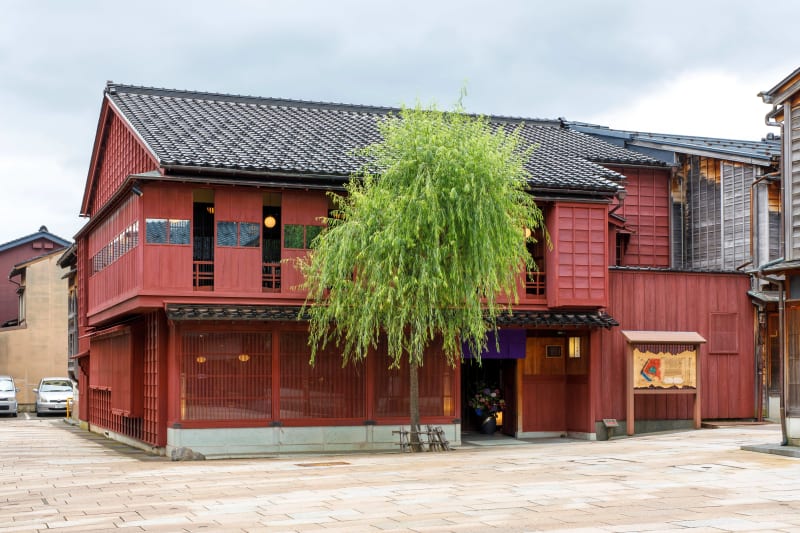 位於金澤市東山的「金澤Shitsurae」是金澤市指定保存建築,也是東茶屋街的代表建築之一。赤紅色外觀、傳統「木蟲籠」格窗與聚樂牆,展現典型茶屋的風貌。如今被活化為工藝展示與體驗空間,其中最具特色的是「貯金箔」體驗。