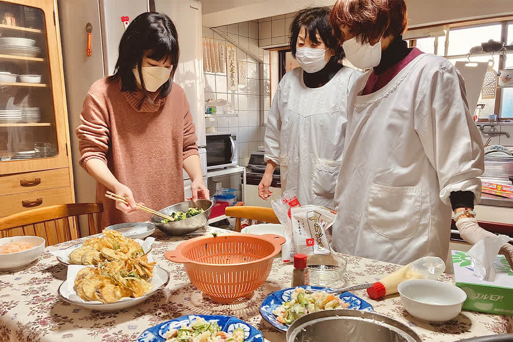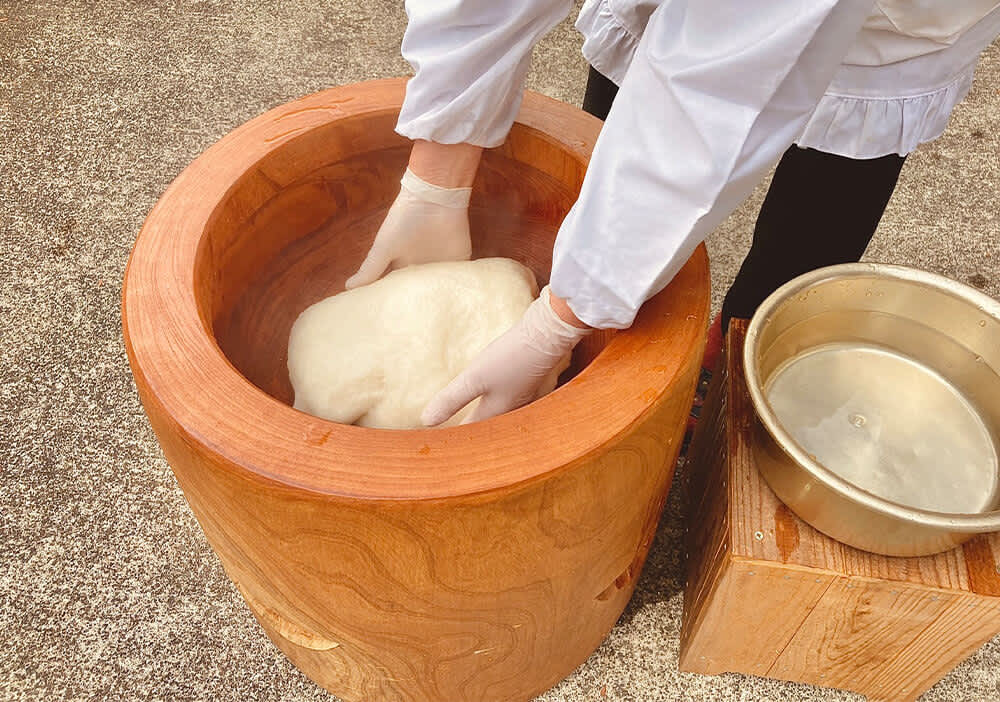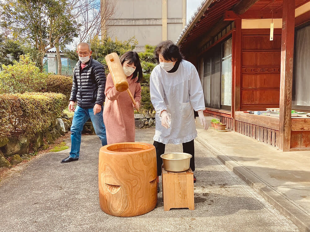 參拜完神社後,我們來到村落居民辻先生的家裡打擾,辻先生與住在附近的婆婆們早已蒸好了糯米、擺設好搗麻糬的道具、連午餐都有準備,迎接我們的到來。