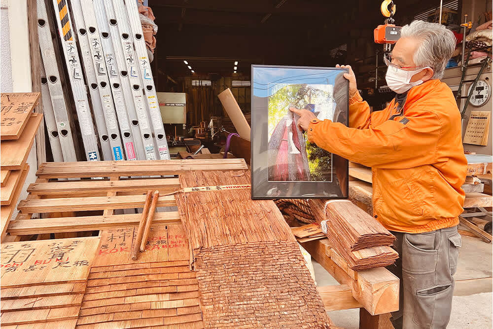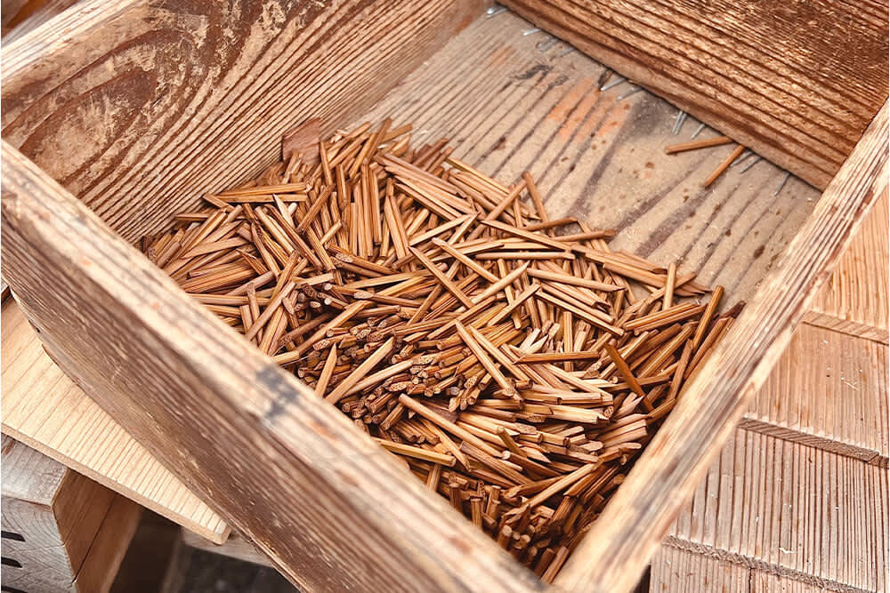 吃飽飯後,我們來到專門負責日本傳統建築更換檜皮葺屋頂等技術的河村社寺工殿社參觀。河村會長為我們介紹了用檜木樹皮鋪造屋頂的「檜皮葺(ひわだぶき)」技術。這種日本自古以來的傳統木造建築技術,在世界的建築史上是獨一無二相當罕見的,於2020年被登錄為聯合國教科文組織無形文化遺產。多用在古老的建築、神社寺廟及宮殿。聽說在GINZA SIX地下的能劇舞台也是出自他的手喔!