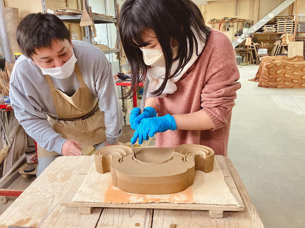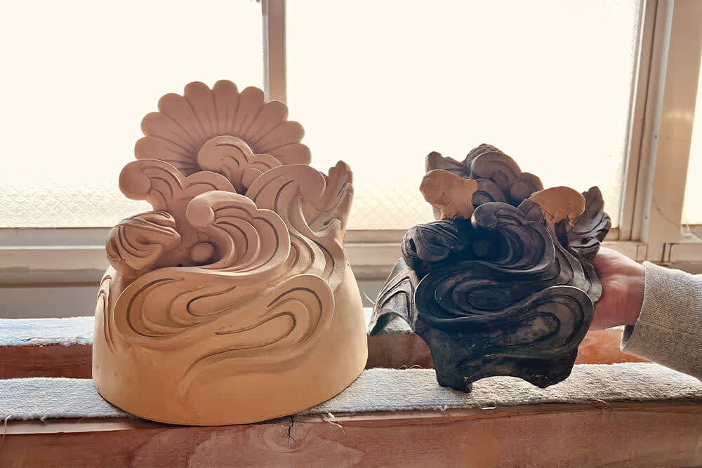 為了重現數百年前的文化財,必須先將原物搬到鬼瓦工房,仔細分析調查它本身的形狀、土的種類、製作方法等,針對壞掉或損傷的部分進行修補...從準備原料、繪製圖面、塑造成形、乾燥、窯烤等到完成鬼瓦的過程更是相當的繁瑣漫長。