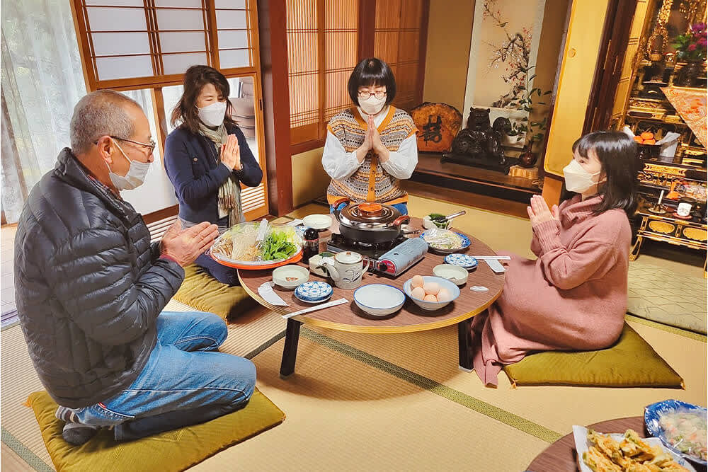 在傳統的日本民宅品嘗雞肉壽喜燒午餐「いただきます!」