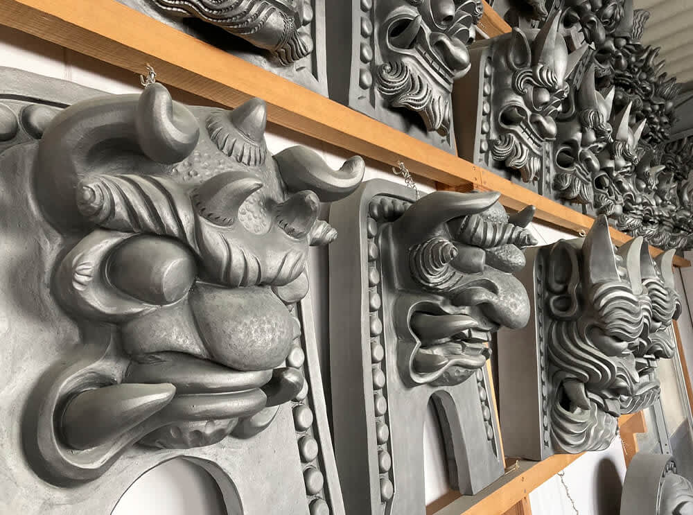 「鬼瓦」是設置在屋頂邊緣的裝飾性瓦片,主要是保護建築本身不受火災等天災的影響和驅厄避邪的作用,同時也具備了防止雨水滲入屋頂的效果。為了驅厄避邪而使用了恐怖的鬼臉造型的鬼瓦居多,目前也有使用家紋或是代表好運的七福神、長壽健康的鶴、龜等造型,因應時代的變化,作為一般的家用擺飾。由於鬼瓦的耐久性相當高,平均能沿用數十年甚至是數百年以上,需求性不高也讓這項技術難以傳承。據說現在在日本擁有這項鬼瓦製作技術的職人「鬼師(おにし)」僅剩下100人左右。