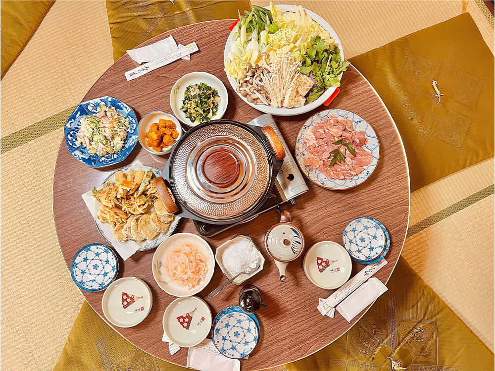 卓袱台上擺放著主菜雞肉壽喜燒和配菜的炸天婦羅、沙拉馬鈴薯等日本的家常料理