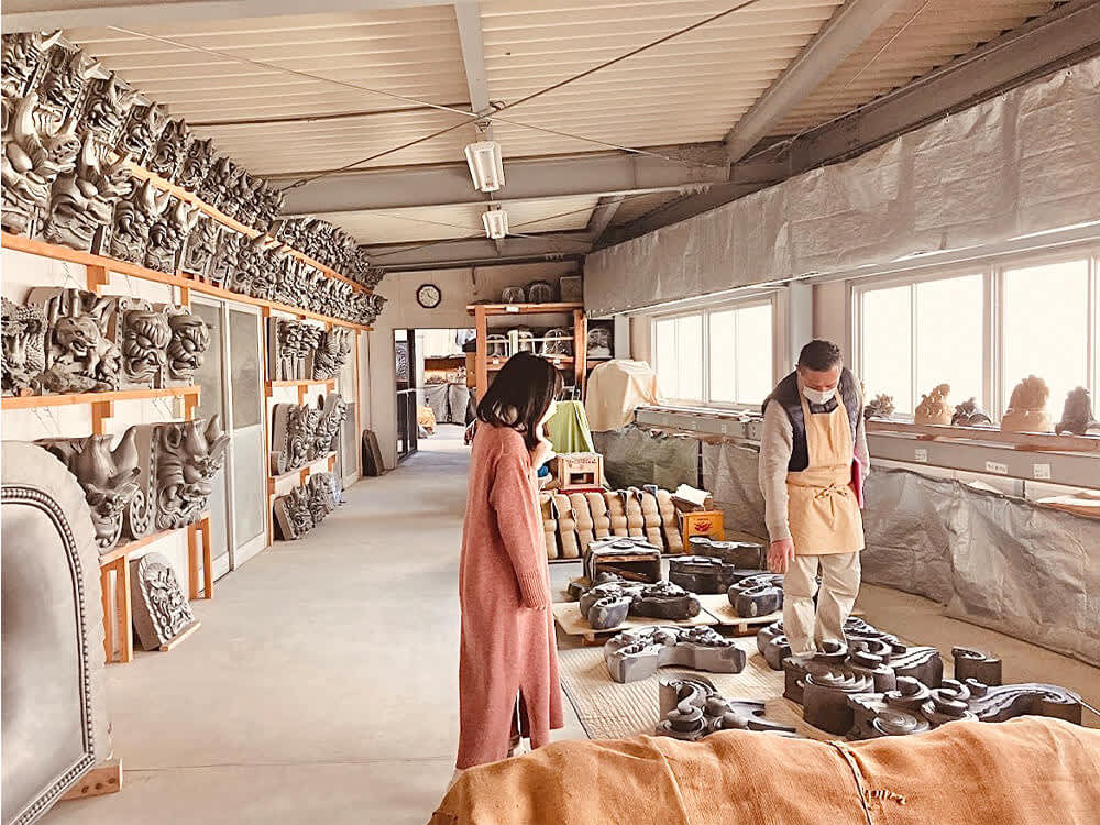 這次我們來到創業百年歷史的美濃邉鬼瓦工房,許多大家熟知的有名神社寺廟、文化財的鬼瓦,都是出自這裡堅持傳統技術的手工製作。鬼瓦師的美濃邉先生非常詳盡的介紹鬼瓦的製作過程,還讓我們欣賞了各式各樣的作品。