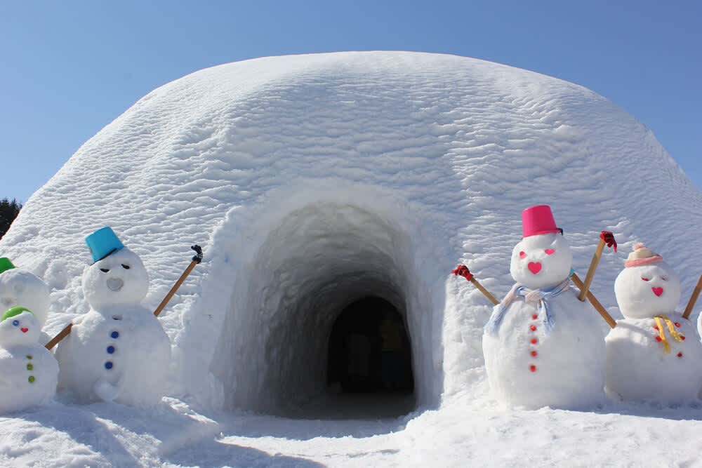 雪洞原本每逢小正月時為了祭祀水神,用雪砌成神座以祈求五穀豐穰、家宅平安的傳統活動。而近年來則成為了廣為人知的雪上遊戲。在雪洞中用雪做張桌子,可以在裡面吃飯或吃點心,享受各種樂趣。天氣好的話還能在一片雪白的雪原上,用雪砌張桌子跟椅子,體會一下雪上野餐的氣氛呢。