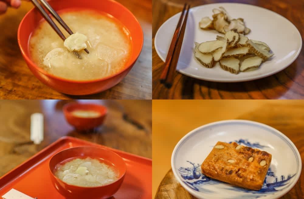 由於我們來訪的時間是過了營業時間的(有事先諮詢店家),所以並沒有享用完整的鄉土料理,但還是品嘗了使用這種豆子的味噌湯,可以吃得出來豆子本身真的滿扎實的,但是透過人力的敲打,感覺是有讓它的口感更加柔軟並入味的。