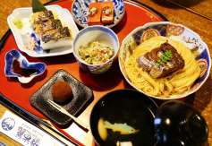 充滿日本風情的街道-長濱黑壁廣場,每走幾步就會看到當地特產的店家,一邊逛一邊試吃好滿足!跟姊妹體驗了「手作果凍蠟燭」,可以自選擇杯型,和喜歡的顏色與裝飾物來完成獨一無二的蠟燭。體驗結束後差不多中午也餓了,我們來到翼果樓用餐,這是在當地很有名氣的鯖魚料理餐廳,店內日本道地的榻榻米座位。在台灣很少有機會吃到鯖魚料理,這次我最喜歡的就是鯖魚壽司,魚完全沒有刺,搭配薑片放入嘴裡香味四溢。而鎮店之寶就是鯖魚素麵!這個素麵與一般的麵線不太一樣,口感特別的順滑,一口麵一口鯖魚真的很享受,另外值得推崇的是店家給的鯖魚每一份都很大,讓人有飽足感。