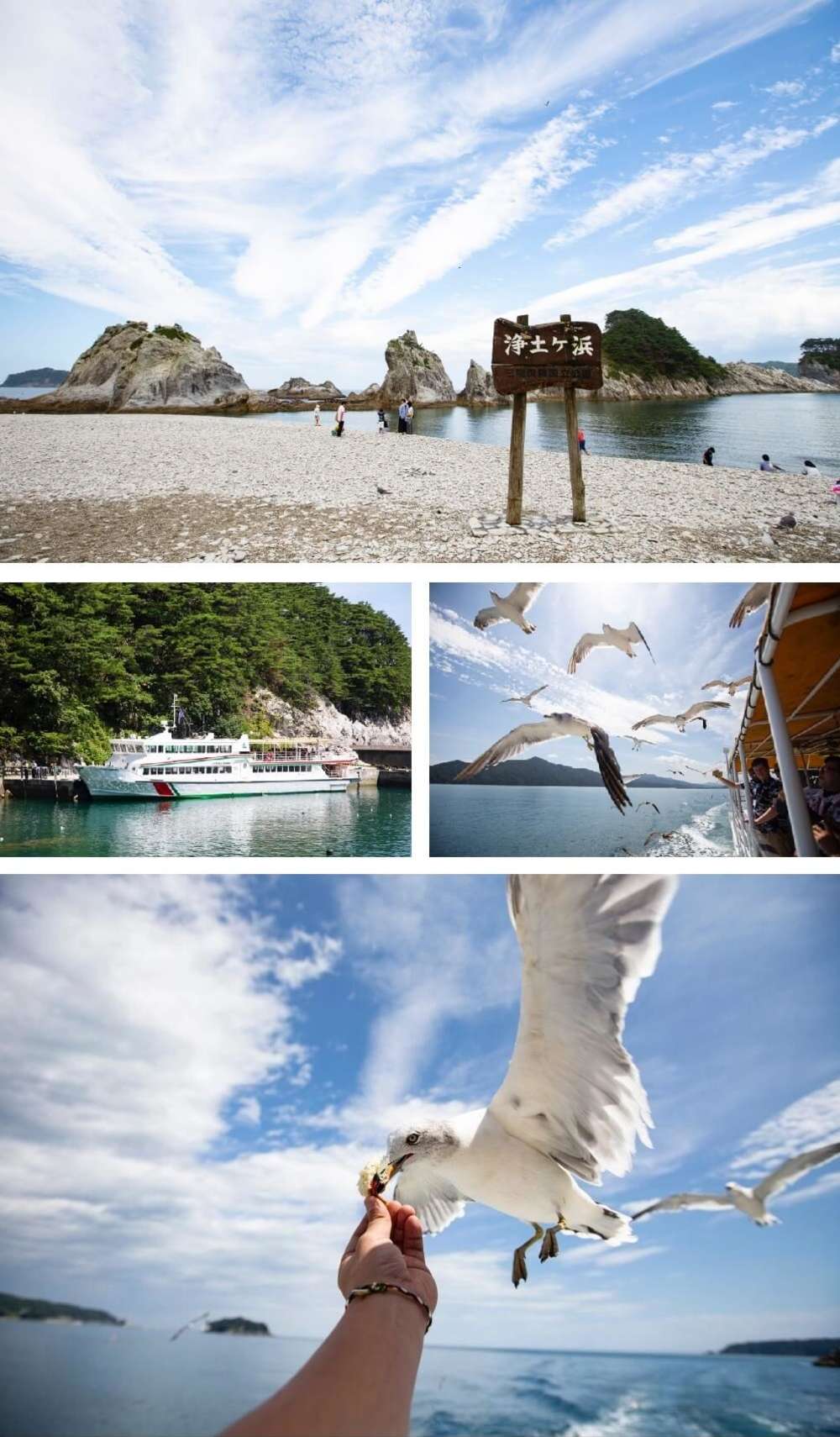 浄土ヶ浜是整個三陸海岸線上我最喜歡的景點,除了能看到太陽從海平面上緩緩升起的美景,附近的浄土ヶ浜觀光船也非常推薦搭乘,除了能從不同角度欣賞三陸海岸美景外,還能留下在甲板上餵養海鷗的難得回憶,除觀光船能搭乘外,還能搭乘小船以較近距離看到海上具有特色的岩石,由於船隻較小,還有機會能進入青の洞窟裡探險,我還曾發生海鷗直接站在頭頂的安全帽上,感覺還真有些重量呢!